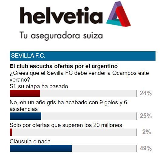 Hay muchas cosas que no se ven de Ocampos, pero que no pasan desapercibidas para la afición del Sevilla FC, que sigue valorando su pundonor y sus 34 dianas y 15 asistencias en 132 encuentros oficiales como blanquirrojo. Así, preguntados en la #EncuestaHelvetiaED por sus preferencias con el argentino en este mercado estival, un mayoritario 49 por ciento de los votantes se declara directamente partidario de retirarle el (teórico) cartel de transferible y remitir a esos pretendientes a los 75 kilos de su cláusula.