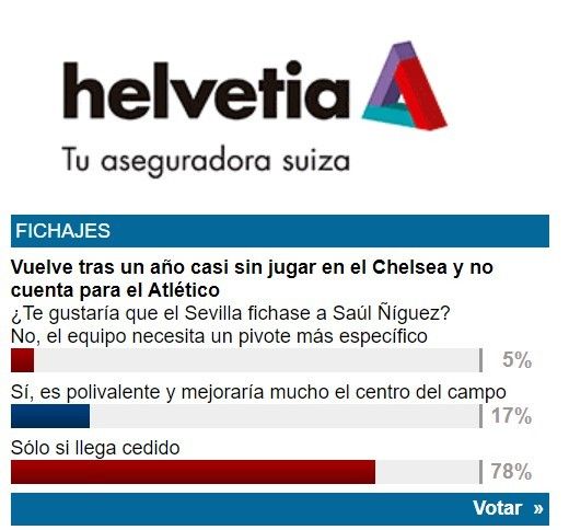 Un préstamo, con el que la mayoría de la afición nervionense coincide con la opinión de Monchi, que lo verían como un gran refuerzo para la próxima temporada siempre y cuando llegará así, a préstamo. Concretamente, un 95% de los participantes en nuestra #EncuestaHelvetiaED creen que sería un buen refuerzo pues es polivalente (puede ocupar otras zonas del centro del campo y la defensa) y daría un salto de calidad a la medular de Lopetegui.