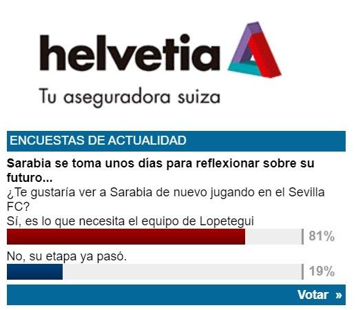 Y es que si por la afición del Sevilla fuera, estaría más que claro. Así, un 81% de los votantes en nuestra #EncuestaHelvetiaED querrían ver de nuevo a Pablo Sarabia con la camiseta del Sevilla FC la próxima temporada, mientras que un 19% cree que su etapa en Nervión ya terminó.