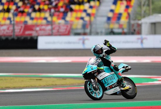 Izan Guevara y Carlos Tatay acompañaron en el podio al piloto italiano, que se hizo con la primera victoria de la temporada en el circuito de Mandalika, en el GP de Indonesia