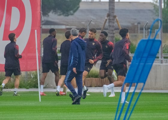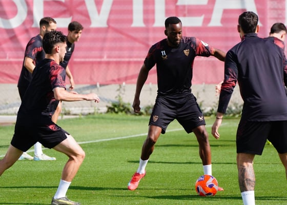 La imagen del entrenamiento del Sevilla: a Lukébakio le cae una 'caparrosina'