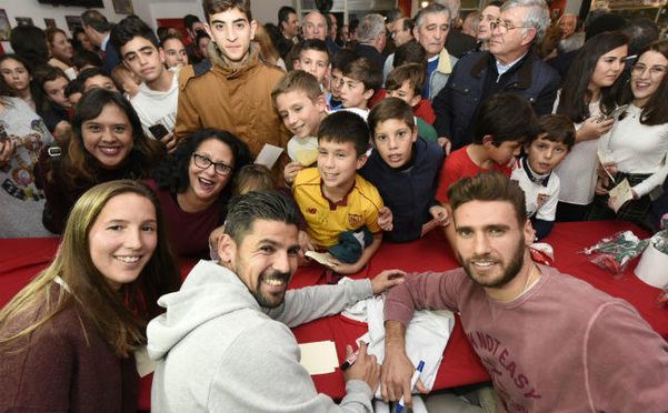 El presidente del Sevilla FC, José Castro, junto a Sergi Gómez y Nolito, ambos jugadores de la primera plantilla, inauguraron una peña sevillista en Coria del Río la…
