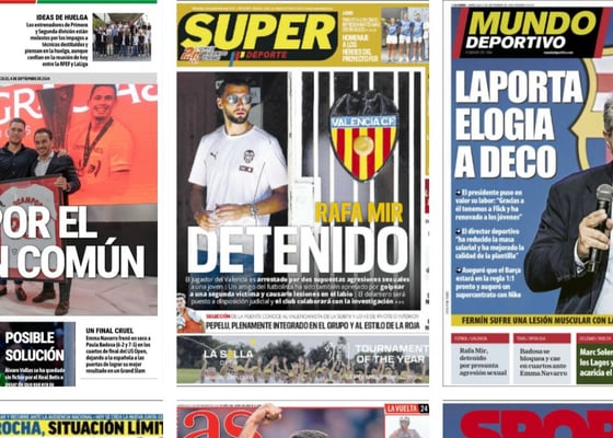 La detención de Rafa Mir, la despedida de Ocampos y Laporta da la cara... así vienen las portadas de hoyManuel Pedrero04/09/2024 08:56La detención de Rafa Mir, la despedida de Ocampos y Laporta da la cara... así vienen las portadas de hoy