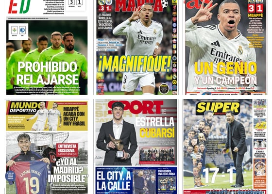 La contundente victoria de Mbappé, lo de Bellingham y un Cubarsí estelar: así vienen las portadasÁlex Martín20/02/2025 09:03La contundente victoria de Mbappé, lo de Bellingham y un Cubarsí estelar: así vienen las portadas