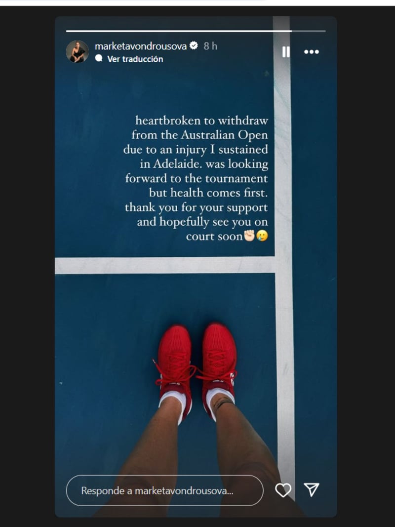 Pese a que la lesión no parecía grave, Vondrousova se marchó de la pista entre lágrimas. Tal vez intuía que eso le impediría estar en el primer Grand Slam de la temporada, como finalmente se ha confirmado. “Me rompe el corazón retirarme del Abierto de Australia debido a una lesión que sufrí en Adelaida. Estaba deseando que llegara el torneo, pero la salud es lo primero. Gracias por vuestro apoyo y espero veros pronto en la pista", publicaba la también medallista olímpica en Tokio 2020 y finalista de Roland Garros en 2019.