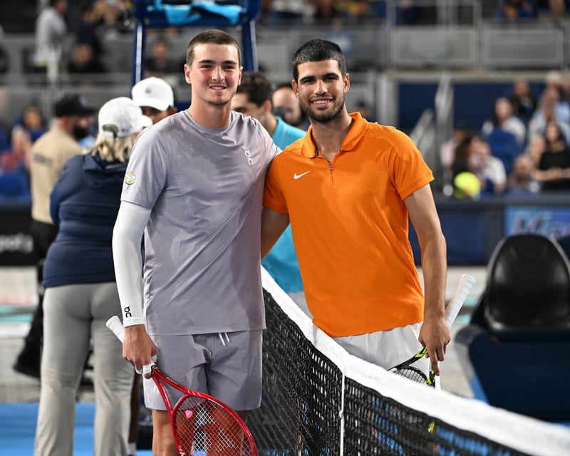 Joao Fonseca y Carlos Alcaraz durante una exhibición en MiamiImago
