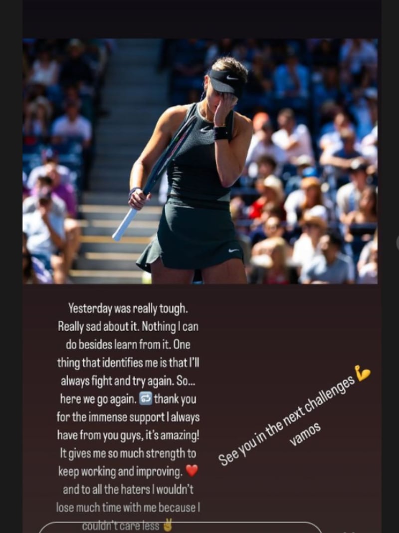 “Ayer fue muy duro. Estoy muy triste por eso. No puedo hacer nada más que aprender de ello. Una cosa que me identifica es que siempre voy a luchar y volver a intentarlo. Así que... Aquí vamos de nuevo. ¡Gracias por el inmenso apoyo que siempre tengo de ustedes, es increíble! Me da tanta fuerza para seguir trabajando y mejorando. Y, a todos los haters, les diría que no pierdan mucho tiempo conmigo porque no me pueden importar menos”, publica hoy la tenista española en sus redes sociales.