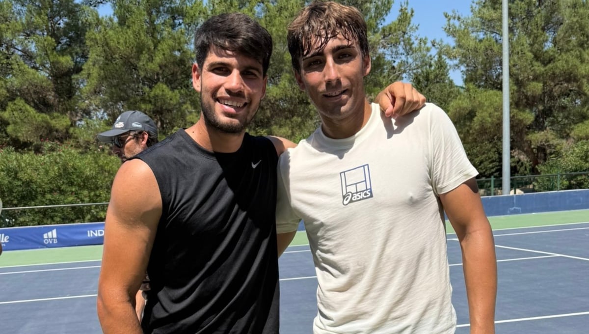 Carlos Alcaraz ha vuelto a entrenarse en casa para seguir adaptándose a la pista dura del Masters 1000 de Cincinatti y el Abierto de Estados Unidos. Y en su última sesión ha 'apadrinado' a otro joven tenista español. El deportista murciano, tras unos días de descanso, ha comenzado su preparación para la última gran cita de la temporada, el 'Major' estadounidense.