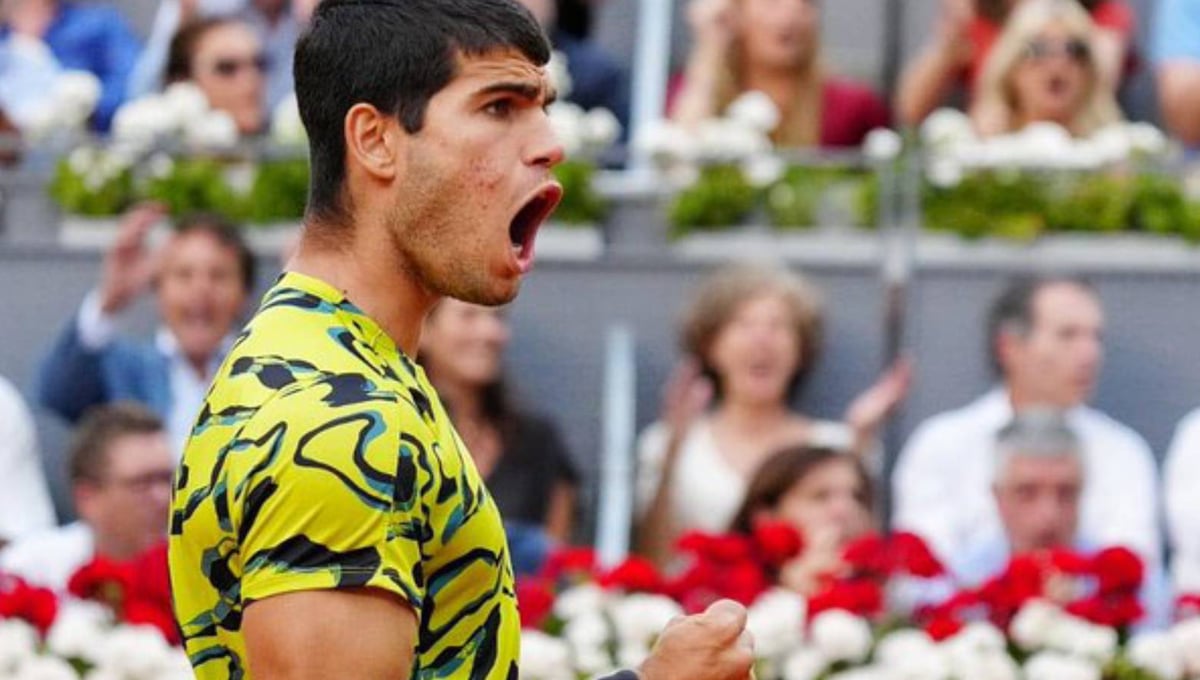 Carlos Alcaraz, celebrando uno de los puntos en Madrid.Twitter / Carlos Alcaraz.