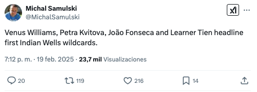 Eso sí, su regreso va a ser posible gracias a que la organización ha decidido darle una wildcard. Sin duda, todo un detalle para una Venus que está a punto de cumplir los 45 años. Junto a la norteamericana, también han sido invitados Petra Kvitova, Joao Fonseca y Learner Tien.