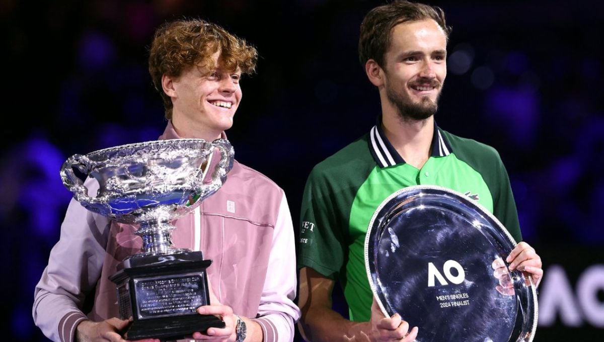 Sinner y Medvedev, con los trofeos del Open de Australia 2024.@australianopen