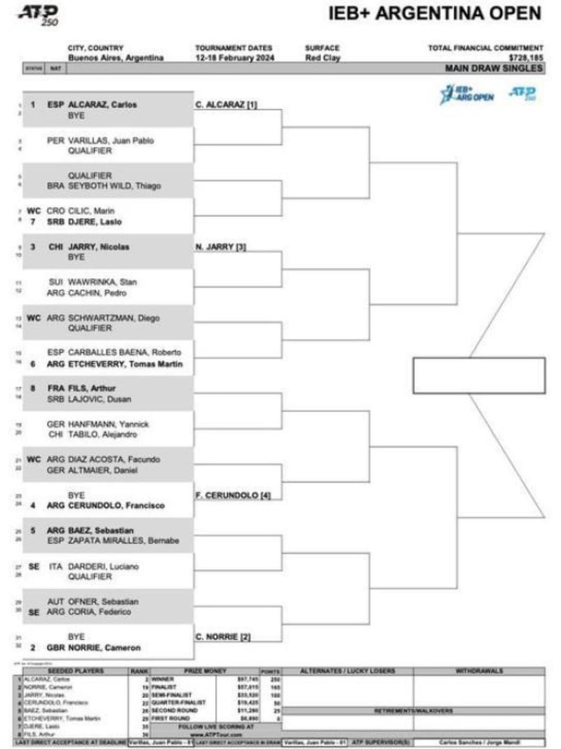 Aunque Norrie no entró como segundo favorito en la inscripción, el mal torneo australiano del chileno Nicolas Jarry le ha hecho perder posiciones y será finalmente Norrie (19 del mundo) el segundo cabeza de serie. Eso ha hecho que vaya por la otra parte del cuadro y que sólo se pueda encontrar con Alcaraz en la final. Pero también ha provocado que, una vez sorteados los puestos 3 y 4 entre los cabezas de serie, Jarry vaya a la parte del cuadro donde está Alcaraz.