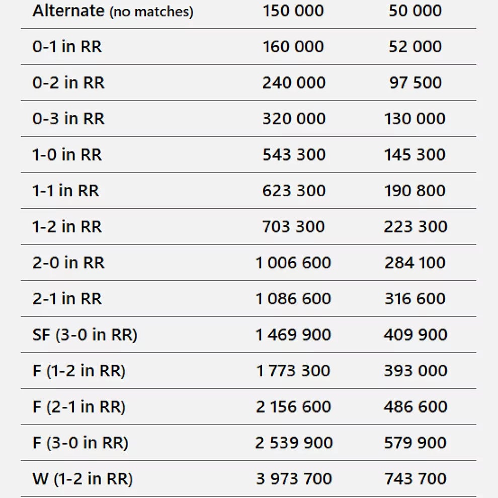 El reparto consta de la siguiente forma: por jugar, un tenista se lleva un fijo de 320.000 dólares a los que hay que sumar 383.300 dólares por cada partido que ganen en la fase de grupos. La victoria en semifinales, a la que accederán los dos primeros de cada grupo, está premiada con 1.070.000 y el triunfo en la final con 2.200.400. Ganar los tres encuentros en los grupos supondrá 1.149.000 dólares.