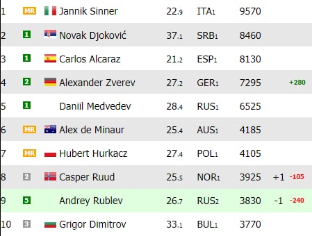 Sinner, Djokovic y Alcaraz se mantienen intactos en el podio, al tiempo que Zverev, pese a su derrota en Hamburgo, sigue cuarto clasificado. Quien no ha podido mantener su plaza después de un nuevo descalabro es Andrey Rublev. El ruso ha caído a la novena plaza y la octava la ocupa ahora el noruego Casper Ruud.