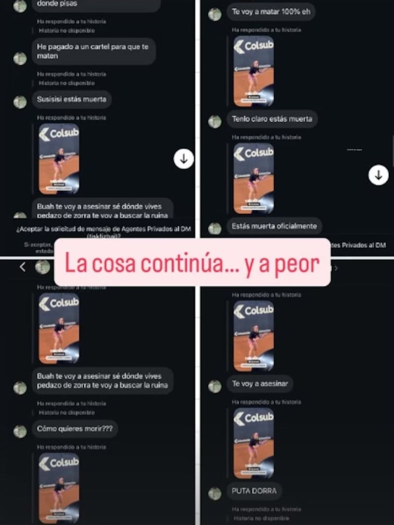 "La cosa continúa... y a peor", señalaba la jugadora española en una storie donde publicaba todas las capturas de las amenazas. En esas capturas se podía ver mensajes deplorables del tipo: "Estas muerta tía, ten cuidado por dónde pisas"; "He pagado a un cártel para que te maten"; "Te voy a asesinar sé donde vives pedazo de zorra"...