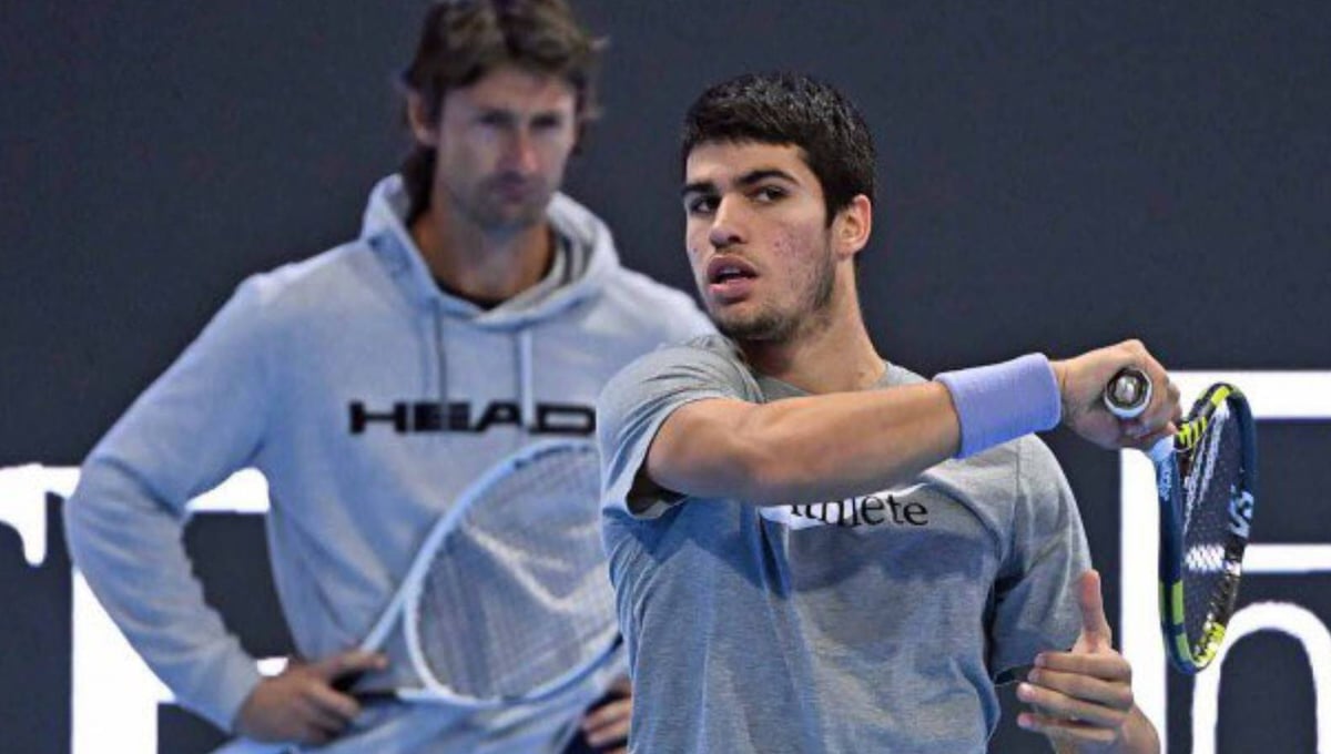 Juan Carlos Ferrero, al fondo, observa un entrenamiento de Carlos Alcaraz.Twitter / Carlos Alcaraz