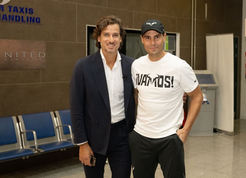 Acompañado de su entrenador, Carlos Moyá, ataviado con una gorra negra y una camiseta blanca con un lema en mayúsculas, el icónico "VAMOS", su grito de guerra en cada partido, Nadal aterrizó en la terminal de vuelos privados del aeropuerto Pablo Ruiz Picasso de Málaga sobre las 18:30 horas.