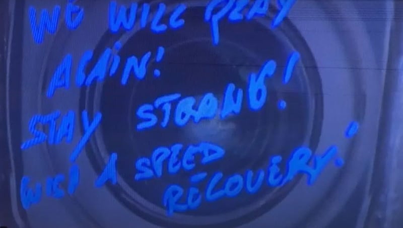 Sin embargo, no quedó ahí la cosa, ya que al final, el ganador de la pista central firma en la cámara. Allí suele dejar un mensaje, una felicitación o, las más veces, sólo su firma. Pero Carlos Alcaraz quiso acordarse de su oponente una vez más y le escribió un mensaje: "Jugaremos de nuevo. Sé fuerte. Ten una pronta recuperación".