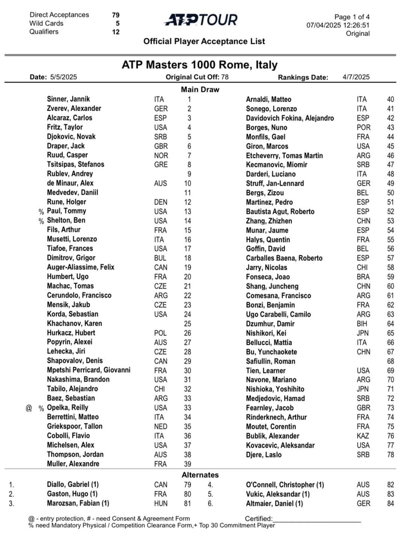 Así, todos los fans de Sinner ya se están frotando las manos con la vuelta del transalpino, quien el próximo día 13 de abril podrá volver a ejercitarse con total normalidad, frente a tenistas del propio circuito ATP. Y aunque no será hasta principios de mayo cuando regrese a la competición, su nombre ya ha aparecido publicado en la lista oficial del ATP Masters 1000 de Roma 2025. Su sanción finaliza el 5 de mayo, mientras que la cita romana en el Foro Itálico se disputará del 7 al 18 de mayo.