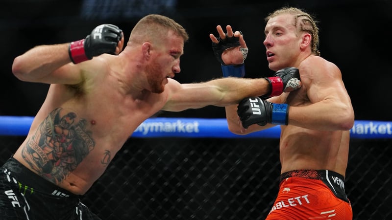 Justin Gaethje golpeando en el rostro de Paddy Pimblett en el UFS 324.@UFC